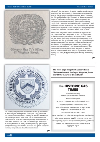 Glasgow%u2019s first gas works for public supplies was known as Townhead and was opened for business early in September 1818 by the Glasgow Gas Light Company. A rival company, the City and Suburban Gas Company of Glasgow, acquired its Act of Parliament and in 1843 began to supply from Dalmarnock, in competition with the original Company. Oddly, both Companies included Glasgow Corporation%u2019s seal and motto on their letterheads. The Corporation was refused permission to establish a third network but was given powers to purchase both Gas Companies, which it did in 1869.These notes are from a rather dour booklet produced by the Corporation Gas Department to mark its %u201cabsorption in the nationalised gas industry on 1st May 1949%u201d. There are five photos, four being portraits of contemporary local politicians and one of Donald F. Young, the Deputy Manager. The forward by the Lord Provost is rather downbeat with his remarks on a Department %u201cwithout the glamour (of) more attractive industries%u201d, and %u201cthere have certainly been complaints%u201d! However, he did have the grace to mention that on 23rd December 1948 the Gas Department sent out 47,310,000 cubic ft of gas, the highest delivery in their long history.JBH%u2022 Issue 101 %u2022 December 2019 %u2022Historic Gas Timespage8page8TheHISTORIC GAS TIMESPublished quarterlyEditors: J.B. Horne and R. ThomasAnnual Subscription UK: %u00a38.00 | Overseas: %u00a315.00 | Via email: %u00a36.00 Cheques payable to: IGEM History FundHGT Subscriptions, IGEM House, 28 High Street, Kegworth, Derbyshire DE74 2DAYou can now pay by Direct DebitIGEM members can subscribe alongside their membershipSubscription enquiries: +44(0) 1509 678 150 or visit www.igem.org.uk/news-and-publications/historic-gas-times/Letters and articles are welcome. Contact us at hgt@igem.org.ukThe front page image first appeared on a Christmas issue of the Segas Magazine, from the 1950s. (Courtesy Brian Sturt)The Pudsey company was incorporated by Act of Parliament in 1845 and first made gas the same year. They purchased the Farsley Gas Consumers Company in 1861 but didn%u2019t close the Farsley gas works until 1928. The UK Gas Corporation took control in 1938 and eventually Pudsey was connected to their West Yorkshire Gas Grid. This enabled gas production at Pudsey to cease on 30th June 1950, not long after Negas (Bradford Group) inherited the business. The official seal of the company is reproduced about twice actual size.JBH