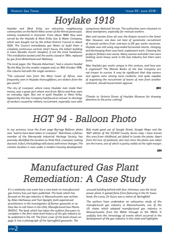 Historic Gas Times%u2022 Issue 95 %u2022 June 2018 %u2022pagepage22Hoylake 1918Hoylake and West Kirby are attractive neighbouring communities on the North West corner of the Wirral peninsular, entirely residential in character. From about 1880 they were served by the Hoylake & West Kirby Gas & Water Company, which was bought out by the Urban District Council in about 1926. The Council immediately got Wests to build them a complete continuous vertical retort house, the tallest building in town (besides church steeples), if not the most handsome. This installation lasted until the works closed in 1954, replaced by gas from Birkenhead and Wallasey.The local paper, the %u2018Deeside Advertiser%u2019, had a column headed %u2018By the Way%u2019 for the smaller snippets and, on 18th October 1918, this column led with the single sentence:- %u201cThe coloured men from the West Coast of Africa, now frequently seen in Hoylake thoroughfares, are stokers from the gas works%u201d.The city of Liverpool, where many Hoylake men made their money, was a great port where men from Africa and Asia were an everyday sight. But not in quiet Hoylake or West Kirby. Apparently the Gas Company had found an answer to shortage of workers caused by military recruitment, especially now with compulsory National Service. The authorities were reluctant to allow exemptions, especially for manual workers.Men and women from all over the Empire served in the Great War. However, one does not hear of systematic recruitment of manual workers from overseas to fill gas works vacancies. Hoylake was still using stop-ended horizontal retorts, charging and discharging them was hard, unpleasant work. Cleaning the producer firebars was worse. Many women and older men were tackling some heavy work in the Gas Industry but there were limits.Was Hoylake gas works unique in this venture, and how was it organised? The Minute Books of the Gas Company are not known to survive. It may be significant that ship owners and agents were among local residents, and quite capable of organising the recruitment of teams of men from another continent, should Government approve.JBH(Thanks to Victoria Doran of Hoylake Museum for drawing attention to the press cutting).It%u2019s a relatively rare event but a new book on manufactured gas history has just been published. The book which has focused on the gas industry in Massachusetts was written by Allen Hatheway and Tom Speight, both experienced practitioners in the investigation of former gasworks or as they like to call them in the USA, Manufactured Gas Plants (MGPs). The book which has taken the authors five-years to complete is the first state-level history of the gas industry to be published in the US. The front cover of the book shown on page 3, has a photograph of the Springfield gasworks. The unusual building behind with four chimneys, was the local power plant, it gained fame from featuring in the Dr Suess book, the Lorax, Dr Seuss was a native of Springfield.The authors have undertaken an exhaustive study of the manufactured gas industry in Massachusetts, one of the US states which adopted manufactured gas industry in Massachusetts from the 1820s through to the 1950s. It usefully lists the chronology of events which occurred in the development of the gas industry in this state and highlights Manufactured Gas Plant Remediation: A Case StudyIn our previous issue the front page Barrage Balloon photo was %u201csaid to have been taken in Liverpool%u201d. Bob Davie, a fellowmember of the Merseyside Industrial Heritage Society, has precisely identified the location as Shiel Park, Liverpool, looking due east. In fact, the buildings still stand, with minor changes. The camera location is now under a modern housing development.Bob made good use of Google Street, Google Maps and the 1927 edition of the 1/2,500 County Series map. I have known this area from childhood, yet failed to locate the photo. Apart from the loss of parkland, also lost since the photo was taken are the trams; one of which is partly visible at the right margin.JBHHGT 94 - Balloon Photo
