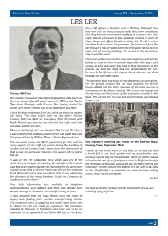page3Historic Gas Times%u2022 Issue 113 %u2022 December 2022 %u2022We recently received an interesting biographical note from Les Lee. Les retired after 40 years%u2019 service in 1991 as the Service Operations Manager with Eastern Gas having started his career with North Thames Gas as an apprentice gas fitter. This is the first instalment from Les, which we think the readers will enjoy. %u201cThe story begins with my late father William Thomas (Bill) Lee BEM an emergency fitter (Pictured) with North Thames gas prior to that with the Gas Light and Coke Company Eastern Division. When he died he left with me a booklet %u201cWe Carried On%u201d that is a war record of the Eastern Division of the Gas Light and Coke Company written by William Dines, a Senior Representative. This document covers the GLCC preparation for War and the many exploits of the staff and events during the bombing of London and the London Docks. Apart from the information of that period, my particular interest is the exploits of my father Bill Lee. It was on the 7th September 1940 which was one of the particularly bad nights of bombing. At midnight whilst bombs were falling an urgent request was received from the West Ham. Council to say that a 48-inch mains was still on fire in Becton Road (Pictured) and it was considered that it was attracting the attention of the enemy bombers. Could the Company do anything to assist them? Very little information was available as telephone communications were difficult and there had already been serious damage to the mains and manufacturing stations. it was assumed that the huge flames were the result of supply back feeding from another manufacturing station. The conditions were so appalling and rather than detail men to attend the call was made for volunteers. The volunteers included W. Meiszner, E. Markham (who later was to be my instructor as an apprentice) my Father Bill Lee as the driver. Plus staff officers J. Kempton and H. Whiting. Although they had been out on many previous raids they were unanimous that they had not encountered anything to compare with that night. Bombs continued to fall, buildings crashed in front of them, shops and offices blazed on either side. To skirt craters the driver had to mount the pavement, fire hoses and force the car through a hail of rubble and shattered glass taking care to keep clear of burning buildings. On arrival at the destination they closed the valve. Flames lit up the area and the noise was deafening with bombs falling so close to them it seemed impossible that they could escape, as time and again they had to fling themselves to the ground. Lee said the night had one compensation for him, for once in his life he could step on the accelerator and drive through the red traffic lights. The operation took two hours in very dangerous circumstances. For his gallant conduct Bill Lee was awarded the British Empire Medal and the other members of the team received a Commendation for Brave Conduct. This is just one example of the planning and the bravery of the employees recorded in the Book %u201dWe Carried On%u201d His will and determination was handed down to me.I really did not know much at this time, as we had just had a bomb fall in our back garden and my grandmother was seriously injured and we moved house. Whist my father stayed in London the rest of our family evacuated to Brighton through the remainder of the Blitz. During the day my father carried out messenger services around the district in a car with a gas bag on top. Unofficially l accompanied on some journeys visiting works, show rooms and depots. Les LeeWe hope to further serialise further instalments of Les Lees autobiography, in future.RTLES LEEThomas (Bill) LeeGas engineers repairing gas mains on the Beckton Road, Canning Town, September 1940.