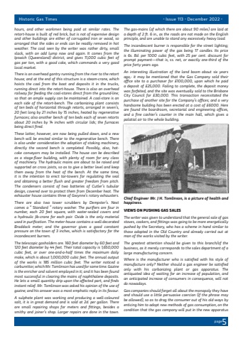 page5Historic Gas Times%u2022 Issue 113 %u2022 December 2022 %u2022hours, and other workmen being paid at similar rates. The retort-house is built of red brick, but is not of expensive design and other buildings are either of corrugated iron or wood, so arranged that the sides or ends can be readily removed in hot weather. The coal seen by the writer was rather dirty, small slack, with an odd lump now and again. It comes from the Ipswich (Queensland) district, and gives 11,000 cubic feet of gas per ton, with a good coke, which commands a very good local market.There is an overhead gantry running from the river to the retort house; and at the end of this structure is a steam-crane, which hoists the coal from the boat and deposits it in the trucks, running direct into the retort-house. There is also an overhead railway for feeding the coal-stores direct from the ground-line; so that an ample supply can be maintained. A coal-store is on each side of the retort-bench. The carbonizing plant consists of ten beds of horizontal through retorts, arranged in seven%u2019s, 20 feet long by 21 inches by 15 inches, heated by regenerative furnaces; also another bench of ten beds each of seven retorts about 20 inches by 14 inches with circular lids; the furnaces being direct fired.These latter, however, are now being pulled down, and a new bench will be erected similar to the regenerative bench. There is also under consideration the adoption of stoking machinery, directly the second bench is completed. Possibly, also, hotcoke conveyors may be installed. The house can be described as a stage-floor building, with plenty of room for any class of machinery. The hydraulic mains are about to be raised and supported on cross joists, so as to give a better level and keep them away from the heat of the bench. At the same time, it is the intention to erect tar-towers for regulating the seal and obtaining a better flush and greater freedom from pitch. The condensers consist of two batteries of Cutler%u2019s tubular design, covered over to protect them from December heat. The exhauster house contains three of Gwynne%u2019s rotary exhausters.There are also two tower scrubbers by Dempster%u2019s. Next comes a %u201c Standard %u201d rotary washer. The purifiers are four in number, each 20 feet square, with water-sealed covers and a hydraulic Jib-crane for each pair. Oxide is the only material used in purification. The meter-house contains a well-decorated Braddock meter; and the governor gives a good constant pressure on the town of 3 inches, which is satisfactory for the incandescent burners.The telescopic gasholders are. 160 feet diameter by 60 feet and 120 feet diameter by 44 feet. Their total capacity is 1,650,000 cubic feet, or over one-and-a-half times the maximum daily make, which is about 1,000,000 cubic feet. The annual output of the works is 185 million cubic feet. The writer noticed a carburettor, which Mr. Tomlinson has used for some time. Gazine is the enricher and solvent employed in it; and it has been found most successful in clearing the mains of naphthalene deposits. He lets a small quantity drip upon the affected part, and finds instant relief. Mr. Tomlinson was asked his opinion of the use of gazine; and his answer was a most emphatic reply in its favour.A sulphate plant was working and producing a well-coloured salt, it is in great demand and is sold at 2d. per gallon. There are small repairing shops for meters and fittings, besides a smithy and joiner%u2019s shop. Larger repairs are done in the town. The gas-mains (of which there are about 90 miles) are laid at a depth of 2 ft. 6 in., as the roads are not made on the English principle, and are unable to stand any excessively heavy load. The incandescent burner is responsible for the street lighting; the illuminating power of the gas being 17 candles. Its price is 6s. 8d. per 1000 cubic feet, with 25 per cent. discount for prompt payment%u2014that is, ss. net, or exactly one-third of the price forty years ago.An interesting illustration of the land boom about six years ago,- it may be mentioned that the Gas Company sold their office site to a purchaser for %u00a3100,000, upon which he paid a deposit of %u00a325,000. Failing to complete, the deposit money was forfeited, and the site was eventually sold to the Brisbane City Council for %u00a330,000. This transaction necessitated the purchase of another site for the Company%u2019s offices; and a very handsome building has been erected at a cost of %u00a36000. Here are found the boardroom, secretarial and engineering offices, and a fine cashier%u2019s counter in the main hall, which gives a palatial air to the whole building.VIEWS ON PUSHING GAS SALESThe writer was given to understand that the general sale of gas stoves, cookers, and fittings was going to be more energetically pushed by the Secretary, who has a scheme in hand similar to those adopted in the Old Country and already carried out at man of the works visited by the writer. The greatest attention should be given to this branch/of the business, as it merely corresponds to the sales department of a large manufacturing concern.Where is the manufacturer who is satisfied with his style of manufacture only? Neither should a gas engineer be satisfied only with his carbonizing plant or gas apparatus. The antiquated idea of waiting for an increase of population, and an anticipated increase of consumers in consequence, will not do nowadays. Gas companies should forget all about the monopoly they have and should use a little persuasive coercion (if the phrase may be allowed), so as to drag the consumer out of his old ways by enticing him to adopt new methods of gas consumption, on the condition that the gas company will put in the new apparatus Chief Engineer Mr. J H. Tomlinson, is a picture of health and happiness.