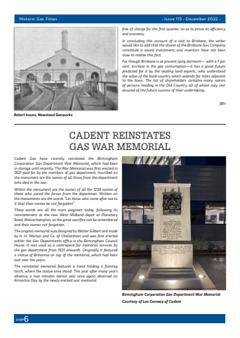 pagepage66Historic Gas Times%u2022 Issue 113 %u2022 December 2022 %u2022free of charge for the first quarter, so as to prove its efficiency and economy.In concluding this account of a visit to Brisbane, the writer would like to add that the shares of the Brisbane Gas Company constitute a sound investment; and investors have not been slow to realize this fact. For though Brisbane is at present lying dormant%u2014 with a 7 per cent. increase in the gas consumption%u2014it has a great future predicted for it by the leading land experts, who understand the value of the back-country which extends for miles adjacent to the town. The list of shareholders contains many names of persons residing in the Old Country, all of whom may rest assured of the future success of their undertaking.JBHRetort house, Newstead GasworksCADENT REINSTATES GAS WAR MEMORIALCadent Gas have recently reinstated the Birmingham Corporation Gas Department War Memorial, which had been in storage until recently. The War Memorial was first erected in 1921 paid for by the members of gas department. Inscribed on the monument are the names of all those from the department who died in the war. Within the monument are the names of all the 1239 names of those who joined the forces from the departmen. Written on the monuments are the words %u201cLet those who come after see to it that their names be not forgotten%u201d. These words are all the more poignant today, following its reinstatement at the new West Midland depot at Planetary Road, Wolverhampton, so the great sacrifice can be remembered and their names not forgotten. The original memorial was designed by Walter Gilbert and made by H. H. Martyn and Co. of Cheltenham and was first erected within the Gas Departments office in the Birmingham Council House. It was used as a centrepiece for memorial services by the gas department from 1921 onwards. Originally it featured a statue of Britannia on top of the memorial, which had been lost over the years. The reinstated memorial features a hand holding a flaming torch, where the statue once stood. This year after many years absence, a two minutes silence was once again observed on Armistice Day by the newly erected war memorial.Birmingham Corporation Gas Department War MemorialCourtesy of Leo Conway of Cadent