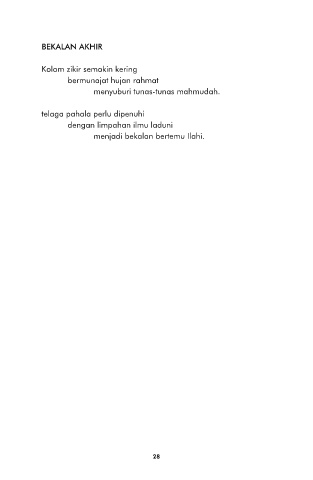 BEKALAN AKHIR Kolam zikir semakin kering bermunajat hujan rahmat menyuburi tunas-tunas mahmudah. telaga pahala perlu dipenuhi dengan limpahan ilmu laduni menjadi bekalan bertemu Ilahi. 28
