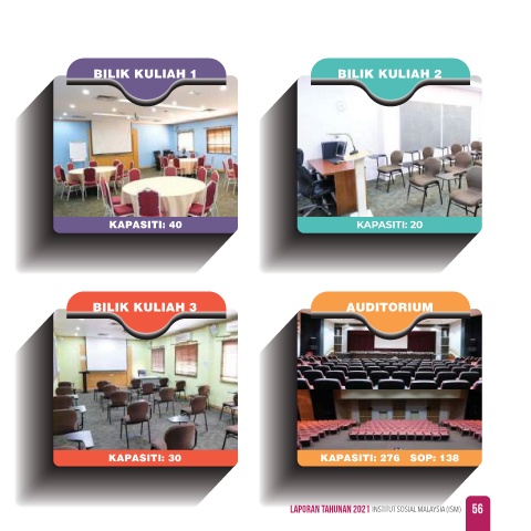 BILIK KULIAH 1 BILIK KULIAH 2 KAPASITI: 40 KAPASITI: 20 BILIK KULIAH 3 AUDITORIUM KAPASITI: 30 KAPASITI: 276 SOP: 138 LAPORAN TAHUNAN 2021 INSTITUT SOSIAL MALAYSIA (ISM) 56