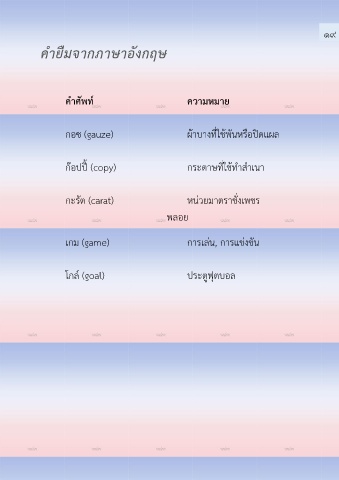 ๑๙ ค ายืมจากภาษาอังกฤษ ค าศัพท ความหมาย ์ กอซ (gauze) ผ้าบางที่ใช้พันหรือปิดแผล ก๊อปปี้ (copy) กระดาษที่ใช้ท าส าเนา กะรัต (carat) หน่วยมาตราชั่งเพชร พลอย เกม (game) การเล่น, การแข่งขัน โกล์ (goal) ประตูฟุตบอล