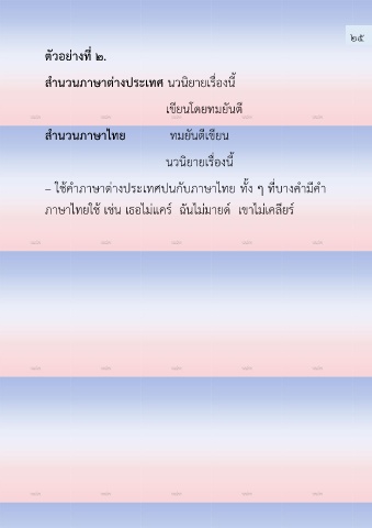 ๒๕ ตัวอย่างที่ ๒. ส านวนภาษาต่างประเทศ นวนิยายเรื่องนี้ เขียนโดยทมยันตี ส านวนภาษาไทย ทมยันตีเขียน นวนิยายเรื่องนี้ – ใช้ค าภาษาต่างประเทศปนกับภาษาไทย ทั้ง ๆ ที่บางค ามีค า ภาษาไทยใช้ เช่น เธอไม่แคร์ ฉันไม่มายด์ เขาไม่เคลียร์