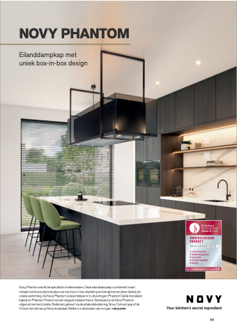 Novy Phantom wordt de eyecatcher in elke keuken. Deze eilanddampkap combineert zwart metaal met doorschijnend glas voor een box-in-box uitstraling en brengt tonnen sfeer dankzij de unieke verlichting. De Novy Phantom is beschikbaar in 2 uitvoeringen: Phantom Cable met stalen kabels en Phantom Frame met een elegant metalen frame. Standaard is de Novy Phantom uitgerust met recirculatie. Bedienen gebeurt via de afstandsbediening, Novy Connect app of de InTouch functie van je Novy kookplaat. Welkom in de keuken van morgen. novy.com