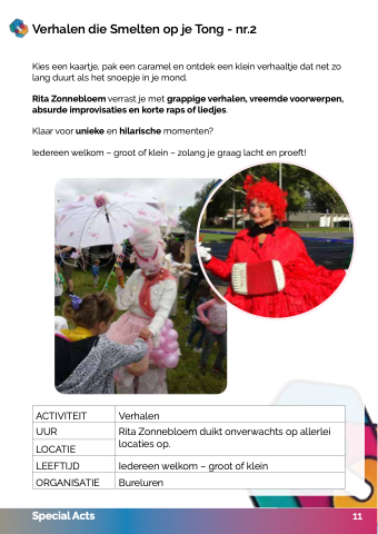 Rita Zonnebloem verrast je met grappige verhalen, vreemde voorwerpen, absurde improvisaties en korte raps of liedjes.