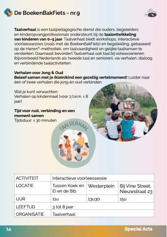 van kinderen van 0–5 jaar. Taalverhaal biedt workshops, interactieve voorleessessies (zoals met de BoekenBakFiets) en begeleiding, gebaseerd op de Hanen®-methodiek, om taalvaardigheid en gelijke taalkansen te versterken. Daarnaast bevordert Taalverhaal ook taal bij volwassenenen (bijvoorbeeld Nederlands als tweede taal en senioren), via verhalen, dialoog en verbindende taalactiviteiten.