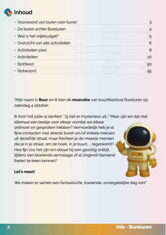 • Voorwoord van buren voor buren 3 • De buren achter Bureluren 4 • Wat is het wijkbudget? 5 • Overzicht van alle activiteiten 6 • Activiteiten plan 8 • Activiteiten 10 • Slotfeest 50 • Slotwoord 55