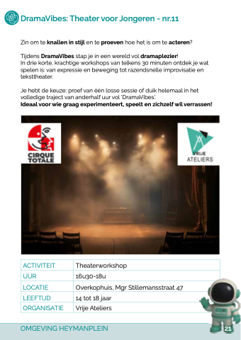 In drie korte, krachtige workshops van telkens 30 minuten ontdek je wat spelen is: van expressie en beweging tot razendsnelle improvisatie en teksttheater.