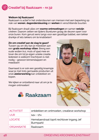 Raakzaam is actief in het ondersteunen van mensen met een beperking op vlak van wonen, dagondersteuning en werken in verschillende buurten.