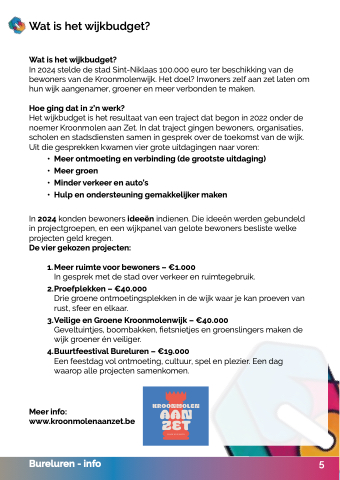 In 2024 stelde de stad Sint-Niklaas 100.000 euro ter beschikking van de bewoners van de Kroonmolenwijk. Het doel? Inwoners zelf aan zet laten om hun wijk aangenamer, groener en meer verbonden te maken.