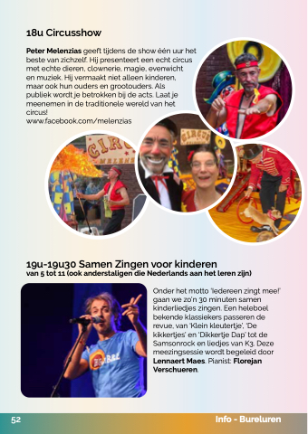 Onder het motto ‘Iedereen zingt mee!’ gaan we zo’n 30 minuten samen kinderliedjes zingen. Een heleboel bekende klassiekers passeren de revue, van ‘Klein kleutertje’, ‘De kikkertjes’ en ‘Dikkertje Dap’ tot de Samsonrock en liedjes van K3. Deze meezingsessie wordt begeleid door Lennaert Maes. Pianist: Florejan Verschueren.