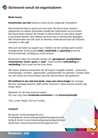Wat ooit een tekst op papier was, hebben we de voorbije jaren samen waargemaakt. Dankzij jullie inzet, creativiteit en goesting bruist de Kroonmolenwijk vandaag als nooit tevoren.