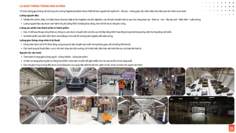 Tổ chức luồng giao thông nội bộ trong nhà xưởng Gigafactory Berlin được thiết kế theo nguyên tắc tuyến tính – liên tục – không giao cắt, nhằm đảm bảo hiệu quả vận hành và an toàn: