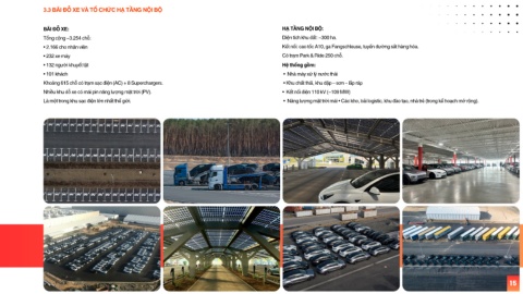 Khoảng 615 chỗ có trạm sạc điện (AC) + 8 Superchargers. • Khu chất thải, khu dập – sơn – lắp ráp