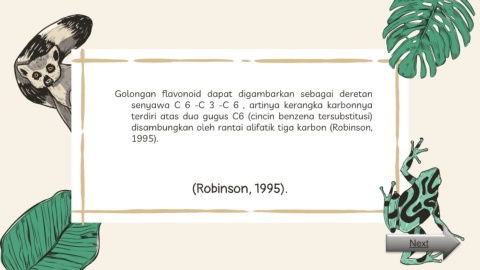 Golongan flavonoid dapat digambarkan sebagai deretan senyawa C 6 -C 3 -C 6 , artinya kerangka karbonnya terdiri atas dua gugus C6 (cincin benzena tersubstitusi) disambungkan oleh rantai alifatik tiga karbon (Robinson, 1995). (Robinson, 1995). Next