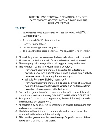 a. Independent contractor status for 1 female GIRL. AALIYAH