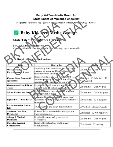 Signed BKT Talent Packet agreement, booking consent, waiver, and service ☐ Completed ☐ In Progress