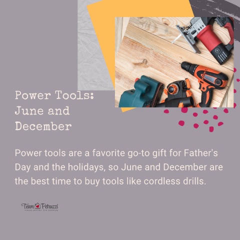 Power Tools: June and December Power tools are a favorite go-to gift for Father's Day and the holidays, so June and December are the best time to buy tools like cordless drills.