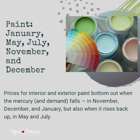 Paint: January, May, July, November, and December Prices for interior and exterior paint bottom out when the mercury (and demand) falls — in November, December, and January, but also when it rises back up, in May and July.
