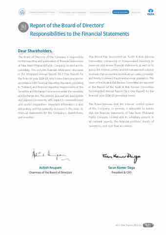 The Board of Directors of the Company is responsible for the reporting and publication of financial statements of Tata Steel (Thailand) Public Company Limited and its subsidiary. This includes financial information disclosed in the Integrated Annual Report (56-1 One Report) for the financial year 2024-25, which have been prepared in accordance with Financial Reporting Standards prevailing in Thailand, and financial reporting requirements of the Securities and Exchange Commission under the Securities and Exchange Act. The policies pursued are appropriate and applied consistently with regard to reasonableness and careful preparation. Important information is also adequately and transparently disclosed in the notes to financial statements for the Company’s shareholders and investors.