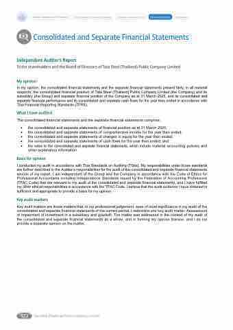 In my opinion, the consolidated financial statements and the separate financial statements present fairly, in all material respects, the consolidated financial position of Tata Steel (Thailand) Public Company Limited (the Company) and its subsidiary (the Group) and separate financial position of the Company as at 31 March 2025, and its consolidated and separate financial performance and its consolidated and separate cash flows for the year then ended in accordance with Thai Financial Reporting Standards (TFRS).