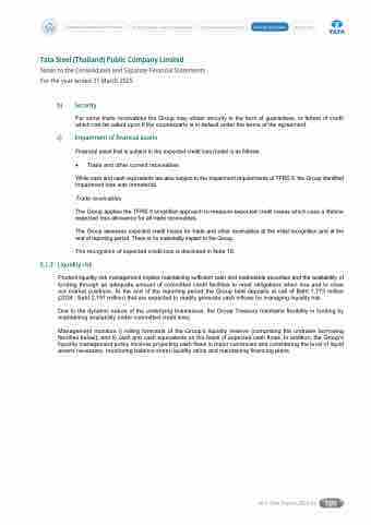 Prudent liquidity risk management implies maintaining sufficient cash and marketable securities and the availability of funding through an adequate amount of committed credit facilities to meet obligations when due and to close out market positions. At the end of the reporting period the Group held deposits at call of Baht 1,773 million (2024 : Baht 2,197 million) that are expected to readily generate cash inflows for managing liquidity risk.