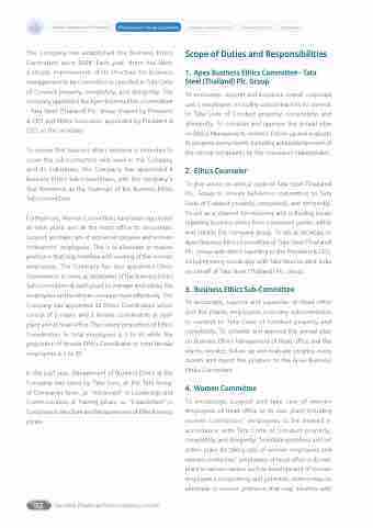 The Company has established the Business Ethics Committee since 2008. Each year, there has been a steady improvement of its structure for business management to be committed as specified in Tata Code of Conduct properly, completely, and stringently. The Company appointed the Apex Business Ethics Committee - Tata Steel (Thailand) Plc. Group chaired by President & CEO and Ethics Counselor, appointed by President & CEO, as the secretary.