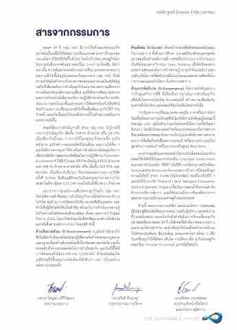 ท้ายนี้ คณะกรรมการบริษัท และฝ่ายบริหาร ขอขอบคุณ ผถู้ อื หนุ้ ผมู้ สี ว่ นไดเ้ สยี ทกุ ภาคสว่ น รวมถงึ ผบู้ รหิ าร และพนกั งาน ที่ร่วมสนับสนุน และเป็นกาลังสาคัญในการขับเคลื่อนธุรกิจ อยา่ งตอ่ เนอ่ื งมาตลอด 28 ปี บรษิ ทั ขอใหค้ า มนั่ วา่ คณะกรรมการ และฝ่ายบริหารทุกท่าน จะดาเนินธุรกิจโดยยึดหลักธรรมภิบาล รับผิดชอบต่อสังคม ส่ิงแวดล้อม และมองหาโอกาสใหม่ ๆ เพ่ือ ขับเคลื่อนธุรกิจให้มั่นคง เติบโต ภายใต้แนวคิด ธุรกิจเศรษฐกิจ หมุนเวียน (Circular Economy) อย่างย่ังยืนต่อไป