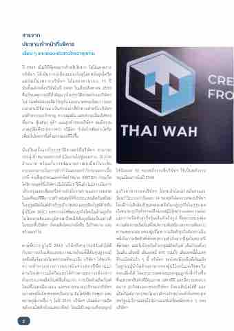 ปี 2565 เป็นปีที่พิเศษมากสําาหรับไทยวา ไม่ใช่แค่เพราะ บริษัทฯ ได้เห็นการเปลี่ยนแปลงไปสู่โลกหลังยุคโควิด แต่ยังเป็นเพราะบริษัทฯ ได้ฉลองครบรอบ 75 ปี นับตั้งแต่ก่อตั้งบริษัทในปี 2490 ในเดือนสิงหาคม 2565 ซึ่งเป็นเหตุการณ์ที่สําาคัญมากในประวัติศาสตร์ของบริษัทฯ ในการเฉลมิ ฉลองอดตี ปจั จบุ นั และอนาคตของไทยวาระยะ เวลาสามปีท่ีผ่านมาเป็นช่วงเวลาที่ท้าทายสําาหรับบริษัทฯ แต่ด้วยความกล้าหาญ ความมุ่งมั่น และความเป็นเลิศของ ทีมงาน หุ้นส่วน คู่ค้า และลูกค้าของบริษัทฯ ผมมีความ ภาคภูมิใจที่จะประกาศว่า บริษัทฯ กําาลังก้าวพ้นจากโควิด เพื่อเป็นไทยวาที่แข็งแกร่งและดียิ่งขึ้น