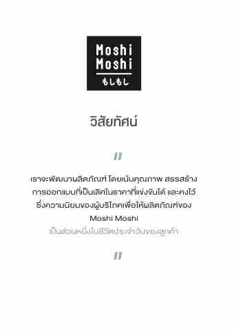 เราจะพัฒนาผลิตภัณฑ์ "โดยเน้นคุณภาพ สรรสร้าง การออกแบบท่ีเป็นเลิศในราคาท่ีแข่งขันได้ และคงไว้ ซึ่งความนิยมของผู้บริโภคเพื่อให้ผลิตภัณฑ์ของ Moshi Moshi เป็นส่วนหน่ึงในชีวิตประจําวันของลูกค้ํา