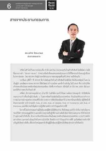 โอกําสนี้ ผมขอขอบคณุ ทํา่ นผถู้ อื หนุ้ และผมู้ สี ว่ นไดเ้ สยี ทกุ ทํา่ น ทสี่ นบั สนนุ และไวว้ ํางใจในกํารดํา เนนิ งําน ของบรษิ ทั ฯ ขอขอบคณุ ผบู้ รหิ ําร และพนกั งํานทกุ คนทปี่ ฏบิ ตั งิ ํานอยํา่ งเตม็ ที่ เตม็ กํา ลงั ควํามสํามํารถ ทํา ให้ MOSHI ก้ําวสู่ควํามสําเร็จอีกขั้น ด้วยกํารเป็นบริษัทจดทะเบียนในตลําดหลักทรัพย์แห่งประเทศไทย เรําจะก้ําวต่อไป อย่ํางมั่นคง และจะดําเนินธุรกิจด้วยควํามโปร่งใส ยึดหลักกํารกํากับดูแลกิจกํารที่ดี มุ่งมั่นพัฒนําองค์กรให้ เจริญเติบโตอย่ํางยั่งยืน เพื่อประโยชน์สูงสุดกลับคืนสู่ผู้ถือหุ้นและผู้มีส่วนได้เสียทุกฝ่ํายอย่ํางยั่งยืนต่อไป