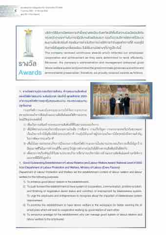 บรษิ ทั ฯ ไดร้ บั รางวลั แหง่ ความสา เรจ็ อยา่ งตอ่ เนอื่ ง อนั สะทอ้ นใหเ้ หน็ ถงึ ความรว่ มมอื รว่ มใจกนั ของพนักงานทุกท่านในการปฏิบัติงานด้วยดีเสมอมา รวมถึงการบริหารจัดการที่มีระบบ แรงงานสัมพันธ์อันดี ส่งเสริมการดาเนินกิจการภายใต้การกากับดูแลกิจการที่ดี ควบคู่ไป กับการใส่ใจดูแลรักษาสิ่งแวดล้อม จึงได้รับรางวัลต่างๆที่น่าภูมิใจ ดังนี้