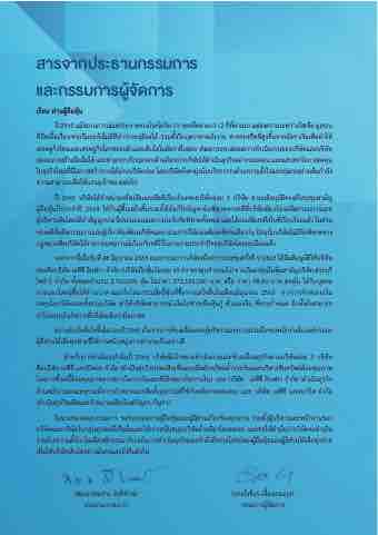 ในนามของคณะกรรมการ ขอขอบคุณท่านผู้ถือหุ้นและผู้มีส่วนเกี่ยวข้องทุกท่าน รวมทั้งผู้บริหารและพนักงานของ บริษัทและบริษัทในกลุ่มทุกคนที่เชื่อมั่นและให้การสนับสนุนบริษัทด้วยดีมาโดยตลอด และขอให้คามั่นว่าบริษัทจะดาเนิน งานดว้ ยความตงั้ ใจ โดยยดึ หลกั ธรรมาภบิ าลในการดา เนนิ ธรุ กจิ และคา นงึ ถงึ ประโยชนข์ องผถู้ อื หนุ้ และผมู้ สี ว่ นไดเ้ สยี ทกุ ฝา่ ย เพื่อให้บริษัทเติบโตอย่างมั่นคงและยั่งยืนต่อไป