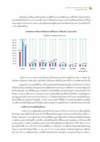 เศรษฐกจิ ทางการเกษตรในปที ผี่ า่ นมา มปี รมิ าณนา้ ฝนสะสมทวั่ ประเทศในชว่ งครงึ่ แรกของปี 2565 มากกวา่ ปกี อ่ น ทา ใหป้ รมิ าณนา้ ในอา่ งเกบ็ นา้ ขนาดใหญแ่ ละขนาดกลางมเี พยี งพอตอ่ การเพาะปลกู ราคาพชื ผลทางการเกษตรเองอยใู่ นเกณฑ์ ดีทาให้เกษตรกรมีการขยายพื้นที่เพาะปลูก อย่างไรก็ตาม ปัจจัยลบท่ีส่งผลกระทบต่อเศรษฐกิจการเกษตรสาหรับปี 2565 น้ันได้แก่ สภาพอากาศท่ีแปรปรวน โดยเฉพาะปรากฎการณ์ลานีญาที่มีกาลังแรงขึ้นในช่วงครึ่งปีหลัง รวมถึงอิทธิพลของ ลมมรสุมและพายุที่เข้ามาหลายระลอกในช่วงไตรมาส 3 ทาให้ฝนตกหนักถึงหนักมากท่ัวประเทศ ส่งผลให้เกิดน้าท่วม ในหลายพื้นที่ของภาคตะวันออกเฉียงเหนือ ภาคกลาง และภาคเหนือ ซ่ึงพ้ืนท่ีทางการเกษตรและผลผลิตบางส่วนได้รับ ความเสยี หาย ดว้ ยปจั จยั พนื้ ฐานเหลา่ นี้ ทา ใหโ้ ดยรวมแลว้ เศรษฐกจิ การเกษตรในปี 2565 ขยายตวั เพยี งรอ้ ยละ 0.80 เทา่ นน้ั