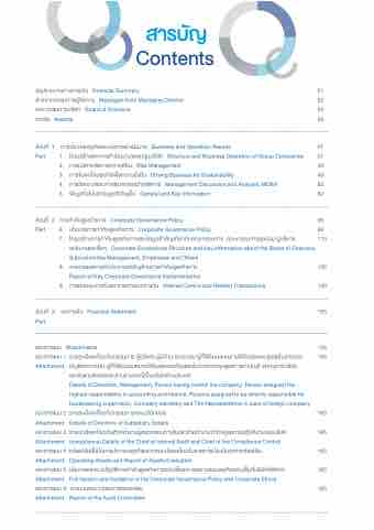 1. โครงสร้างและการดาเนินงานของกลุ่มบริษัท Structure and Business Operation of Group Companies 07 2. การบริหารจัดการความเสี่ยง Risk Management 42 3. การขับเคลื่อนธุรกิจเพื่อความย่ังยืน Driving Business for Sustainability 46 4. การวิเคราะห์และคาอธิบายของฝ่ายจัดการ Management Discussion and Analysis; MD&A 62 5. ข้อมูลท่ัวไปและข้อมูลสาคัญอ่ืน General and Key Information 92