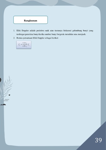 Rangkuman 1. Efek Doppler adalah peristiwa naik atau turunnya frekuensi gelombang bunyi yang terdengar penerima bunyi ketika sumber bunyi bergerak mendekat atau menjauh. 2. Rumus persamaan Efek Doppler sebagai berikut: 39