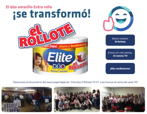 El dúo amarillo Extra rollo Nuevo nombre: El Rollote Ahora con más metros: 35 metros TH ¡Más rendimiento! Realizamos el lanzamiento del nuevo papel higiénico “Elite Dúo El Rollote TH X1” a las fuerzas de venta del canal TAT
