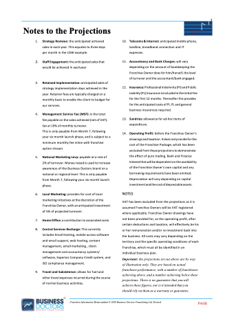 VAT has been excluded from the projections as it is assumed Franchise Owners will be VAT registered where applicable. Franchise Owner drawings have not been provided for, as the operating profit, after certain deductions and taxation, will effectively be his or her remuneration and/or re-investment back into the business. All costs may vary depending on the territory and the specific operating conditions of each Franchise, which must all be identified in an individual business plan.