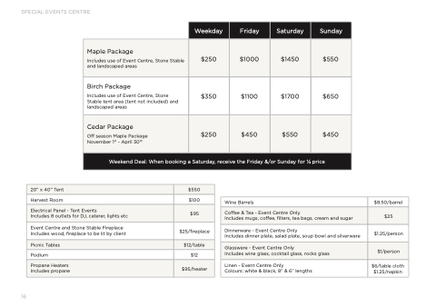 Includes use of Event Centre, Stone Stable tent area (tent not included) and landscaped areas