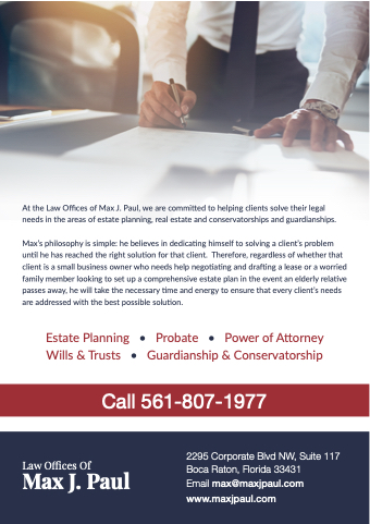 At the Law Offices of Max J. Paul, we are committed to helping clients solve their legal needs in the areas of estate planning, real estate and conservatorships and guardianships.