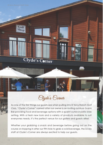 As one of the first things our guests see when pulling into D’Arcy Ranch Golf Club, “Clyde’s Corner” named after our owner is an inviting outdoor Snack Bar providing food and beverage options with a quaint outdoor patio style setting. With a fresh new look and a variety of prodcuts available to suit everyones needs, it’s the perfect venue for our golfers and guests alike!