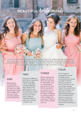 vary in body type, consider differing dress styles in the same color to suit their different shapes. Another option is to choose the same style of dress in varying shades of color, for a unique “ombré” look.