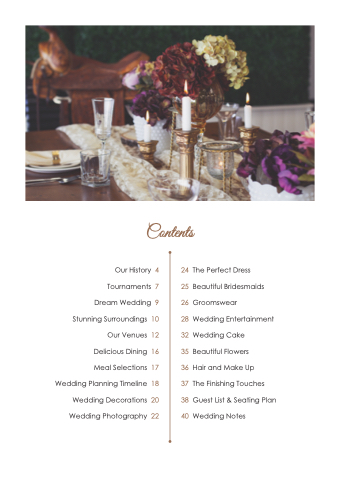 Our History 4 Tournaments 7 Dream Wedding 9 Stunning Surroundings 10 Our Venues 12 Delicious Dining 16 Meal Selections 17 Wedding Planning Timeline 18 Wedding Decorations 20 Wedding Photography 22