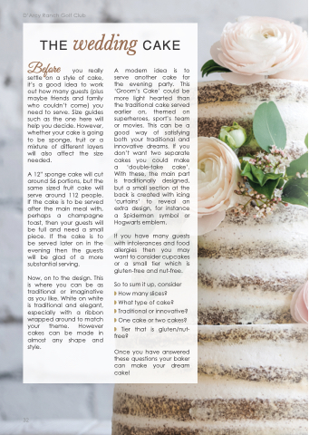 you really settle on a style of cake, it’s a good idea to work out how many guests (plus maybe friends and family who couldn’t come) you need to serve. Size guides such as the one here will help you decide. However, whether your cake is going to be sponge, fruit or a mixture of different layers will also affect the size