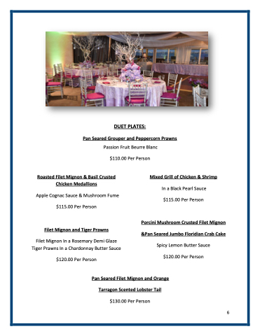 Porcini Mushroom Crusted Filet Mignon &Pan Seared Jumbo Floridian Crab Cake Spicy Lemon Butter Sauce $120.00 Per Person