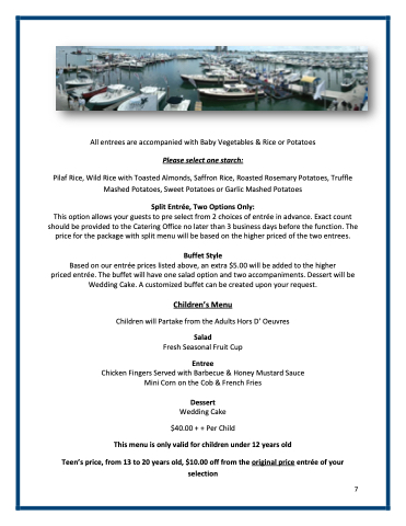 Based on our entrée prices listed above, an extra $5.00 will be added to the higher priced entrée. The buffet will have one salad option and two accompaniments. Dessert will be Wedding Cake. A customized buffet can be created upon your request.