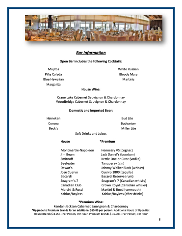 *Upgrade to Premium Brands for an additional $15.00 per person. Additional Hours of Open Bar: House Brands $ 8.95++ Per Person, Per Hour. Premium Brands $ 10.00++ Per Person, Per Hour