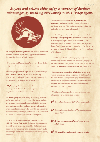 • In addition to the Dorey listing agent, our full-time licensed office team members are actively engaged in the presentation and representation of each of our homes and are in frequent communication with our sellers.